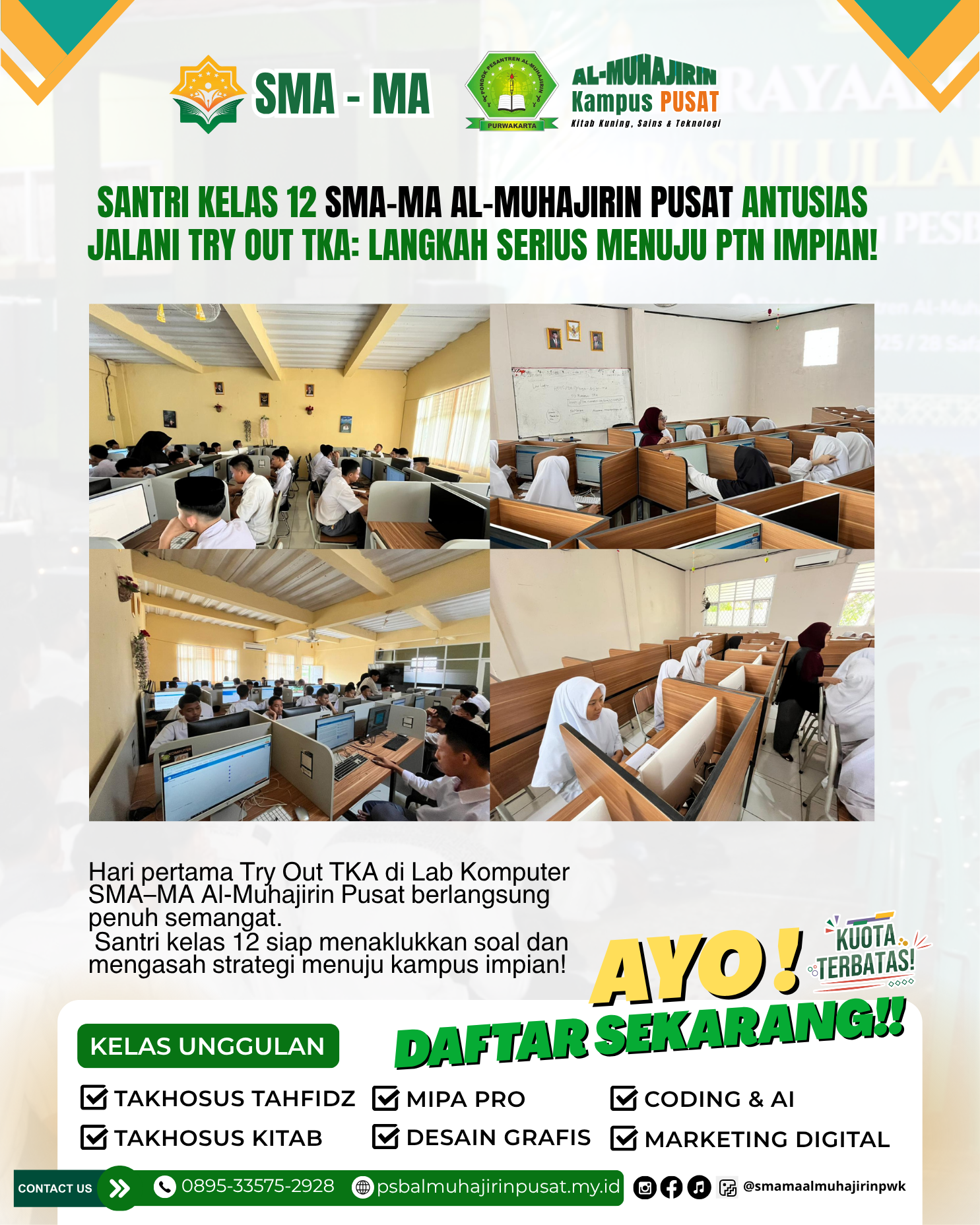 Purwakarta – Hari ini menjadi momen penting bagi seluruh santri kelas 12 SMA–MA Al-Muhajirin Pusat! Selama tiga hari ke depan, mereka akan menghadapi Try Out Tes Kemampuan Akademik (TKA) sebagai simulasi persiapan menuju Seleksi Nasional Penerimaan Mahasiswa Baru (SNPMB) 2026.