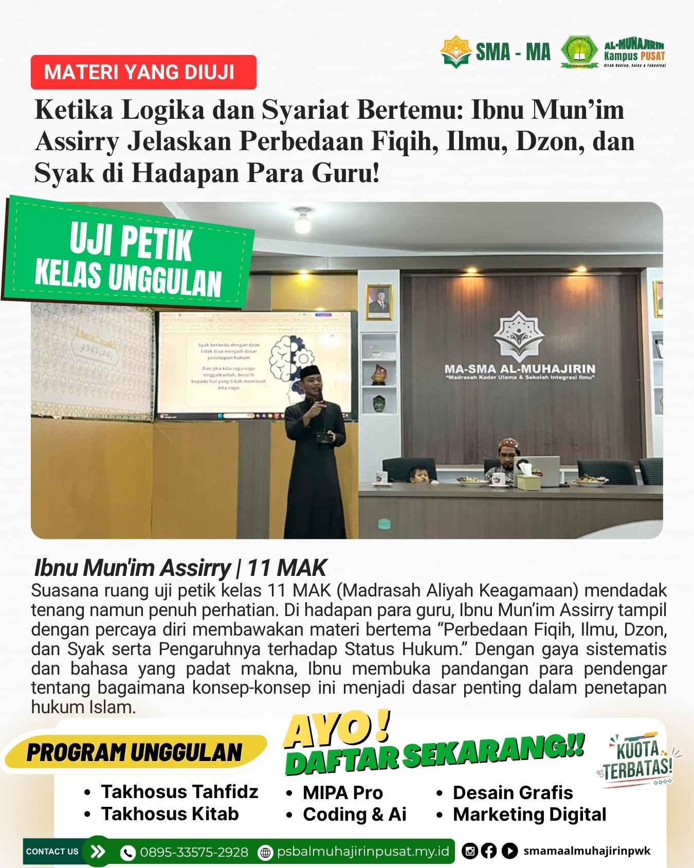 Suasana ruang uji petik kelas 11 MAK (Madrasah Aliyah Keagamaan) mendadak tenang namun penuh perhatian. Di hadapan para guru, Ibnu Mun’im Assirry tampil dengan percaya diri membawakan materi bertema “Perbedaan Fiqih, Ilmu, Dzon, dan Syak serta Pengaruhnya terhadap Status Hukum.” Dengan gaya sistematis dan bahasa yang padat makna, Ibnu membuka pandangan para pendengar tentang bagaimana konsep-konsep ini menjadi dasar penting dalam penetapan hukum Islam.