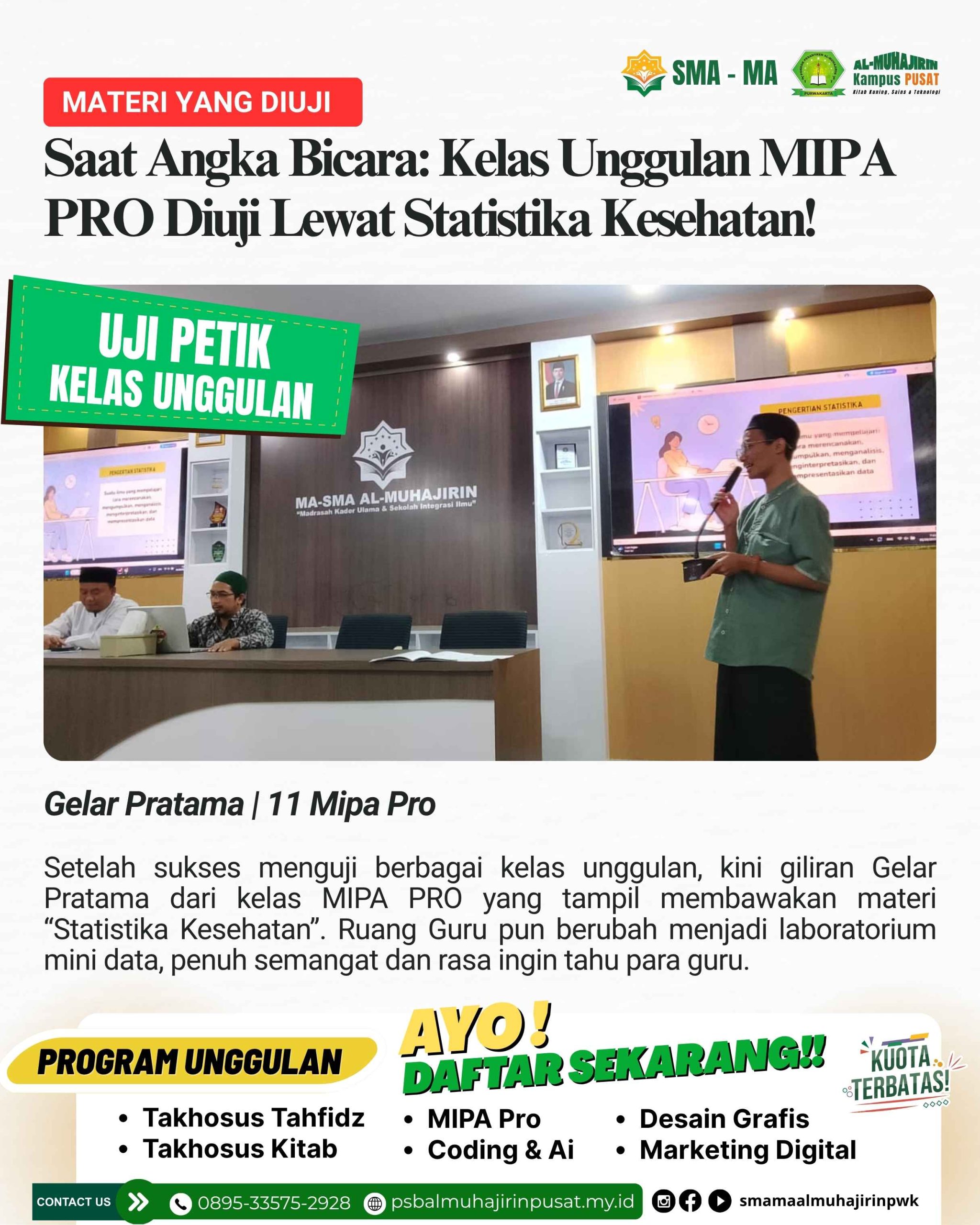 Ruang kelas unggulan MIPA PRO mendadak hening penuh fokus pagi ini. Semua mata tertuju pada Gelar Pratama, siswa yang tampil percaya diri di hadapan para guru dalam sesi uji petik kelas unggulan. Kali ini, topik yang dibahas bukan main-main — Statistika Kesehatan — sebuah bidang yang menggabungkan ilmu data dengan kepedulian terhadap kehidupan manusia.