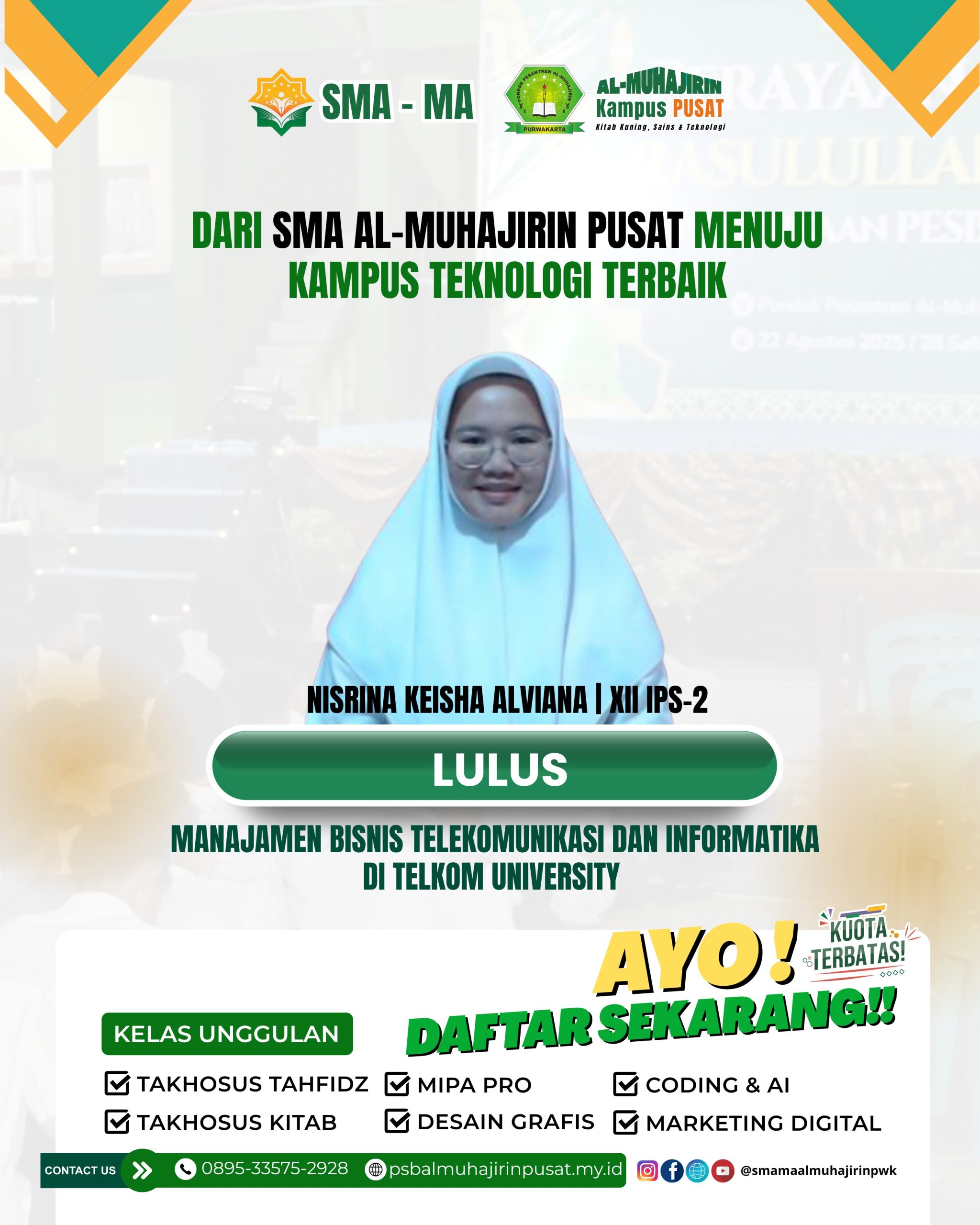 Prestasi membanggakan kembali datang dari SMA Al-Muhajirin Pusat. Kali ini, Nisrina Keisha Alvinia, siswi kelas XII IPS-2, membuktikan bahwa minat di bidang sosial tidak menjadi halangan untuk meraih impian di kampus teknologi ternama. Ia berhasil diterima di program studi Manajemen Bisnis Telekomunikasi dan Informatika, Telkom University Bandung.