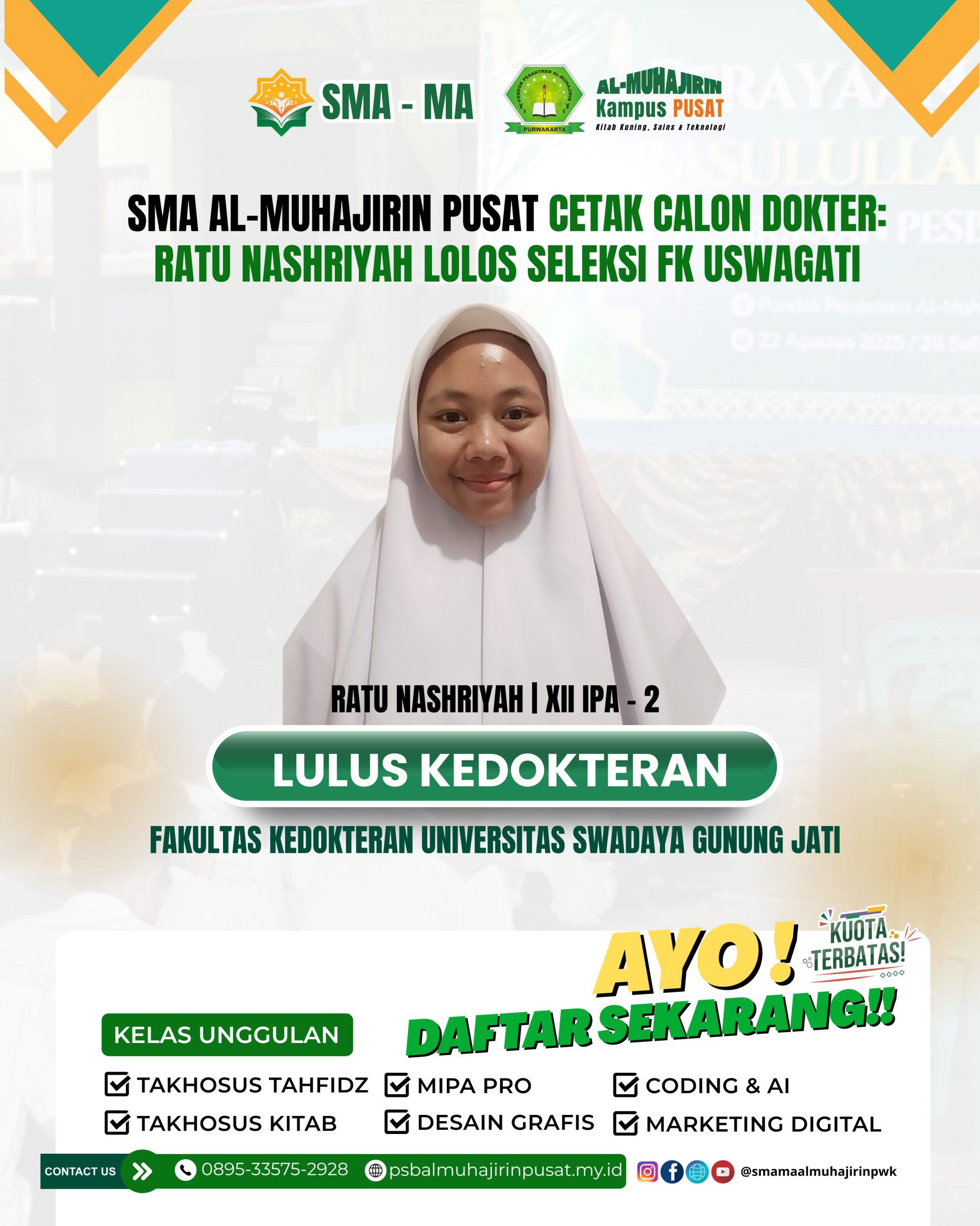 SMA Al-Muhajirin Pusat kembali mencatatkan prestasi membanggakan. Salah satu siswi terbaiknya, Ratu Nashriyah dari kelas XII IPA-2, berhasil lolos seleksi dan diterima di Fakultas Kedokteran Universitas Swadaya Gunung Jati (Uswagati). Kesuksesan ini menjadi bukti nyata kualitas pendidikan dan bimbingan yang diberikan oleh sekolah.