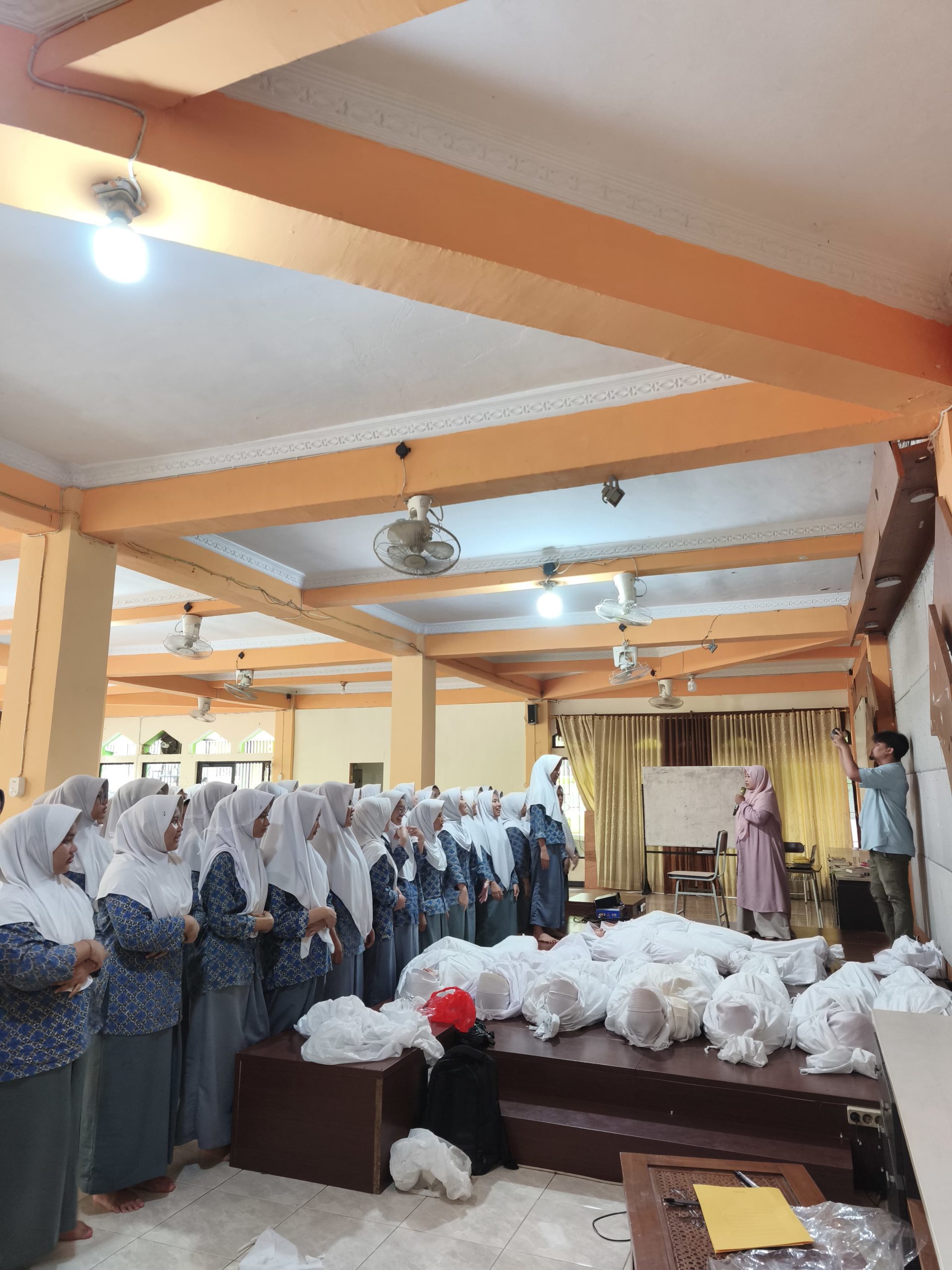 Pelaksanaan kegiatan dibagi menjadi dua lokasi. Santri putra mengikuti praktik di Aula SDK dengan pemateri Wahyudin, S.Ud, sementara santri putri bertempat di Aula Ummi dengan pemateri Yuli Yuliah, S.Ag. Kedua pemateri memberikan penjelasan secara sistematis mulai dari proses memandikan, mengkafani, menshalatkan, hingga tata cara pemakaman jenazah.